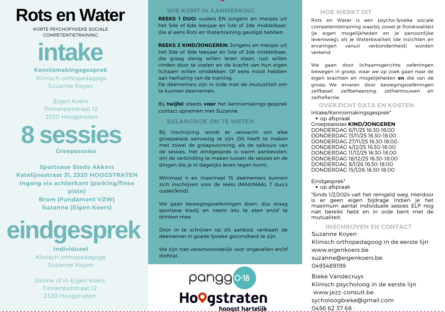 Rots en Water -vanaf 5de leerjaar tot en met 2de middelbaar. Deze reeks zal doorgaan in Sportoase Stede Akkers Hoogstraten in samenwerking met Bram (fundament vzw) Het kennismakingsgesprek en meer informatie kan aangevraagd via het contactformulier.